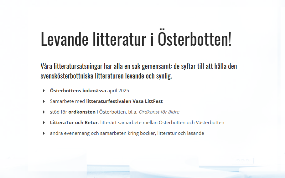 Österbottens bokmässa Admin april 29, 2025 Nyheter Dessvärre fick vi information om Österbottens bokmässa för sent, den har precis varit – men förhoppningsvis kommer den tillbaka nästa år. Österbottens bokmässa på Academill i Vasa är ett samlande forum för... Read More